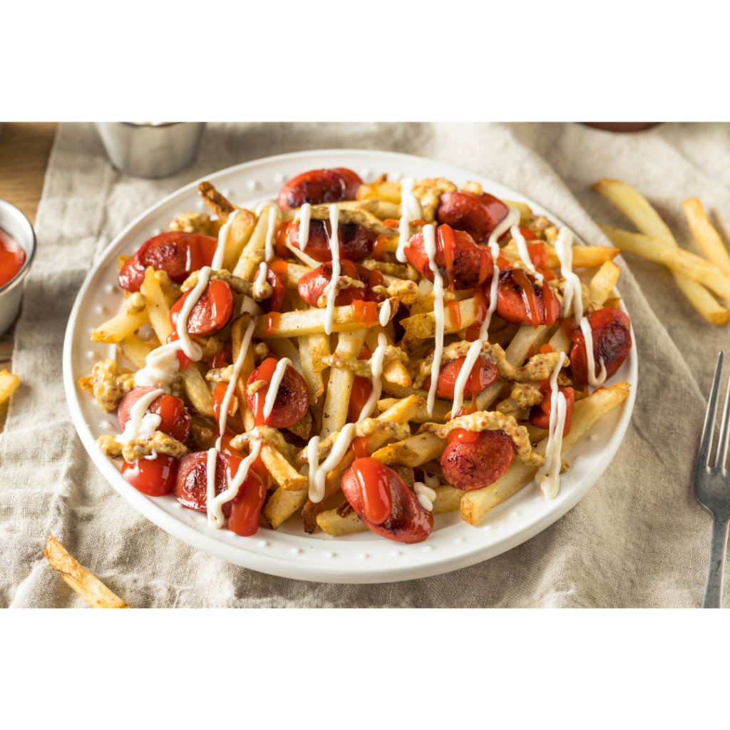 Papas, salchicha, queso, pollo desmechado